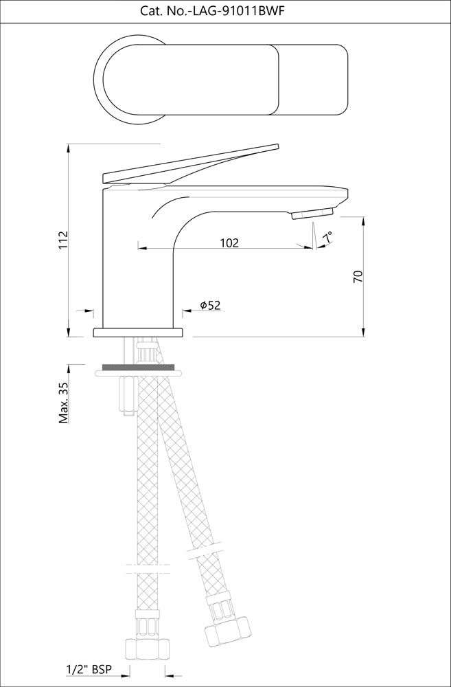 Single Lever Basin Mixer without Popup Waste, with 375mm Long Braided Hoses and Base Flange